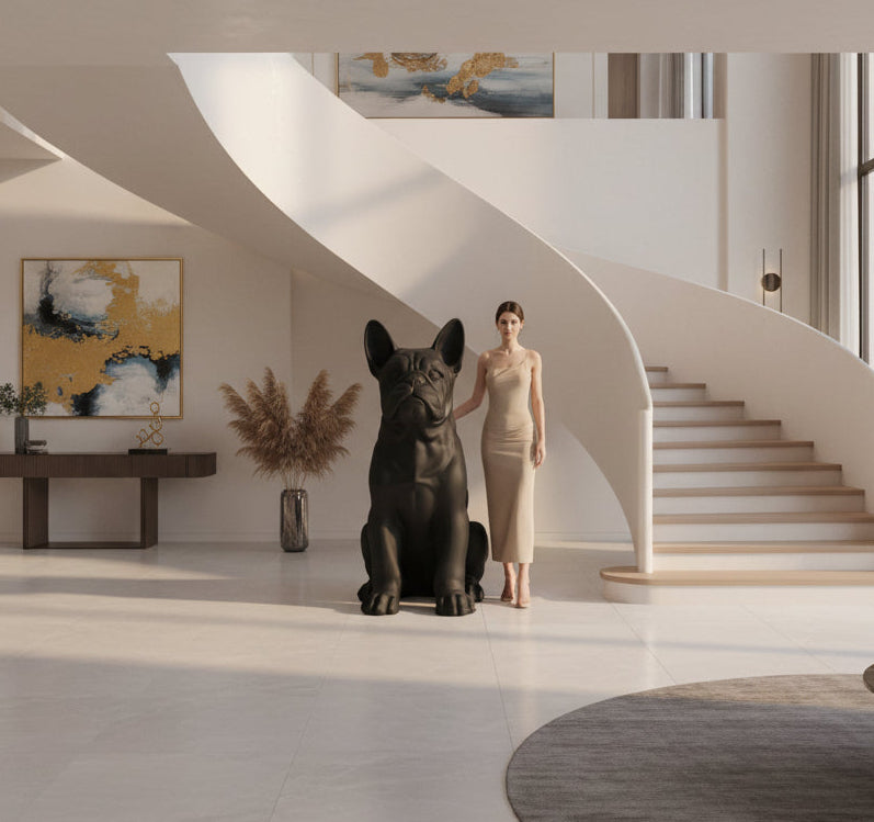 With its realistic proportions, compact body and seated posture, it feels like a monumental design piece inspired by a bulldog, perfectly suited for modern interiors, villas and high-end hospitality projects.