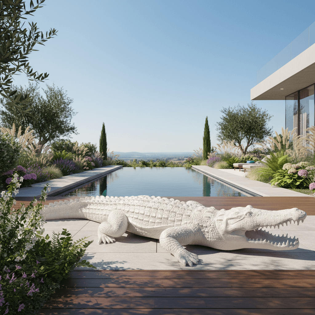 At 320 cm in length, this crocodile draws a panoramic silhouette that occupies the space horizontally. It works beautifully along a wall, near a large window, beside a pool view, in an entrance, a lounge area or as a signature piece in a lobby or showroom. Its generous dimensions turn it into an immediate focal point while preserving a refined, contemporary aesthetic.
