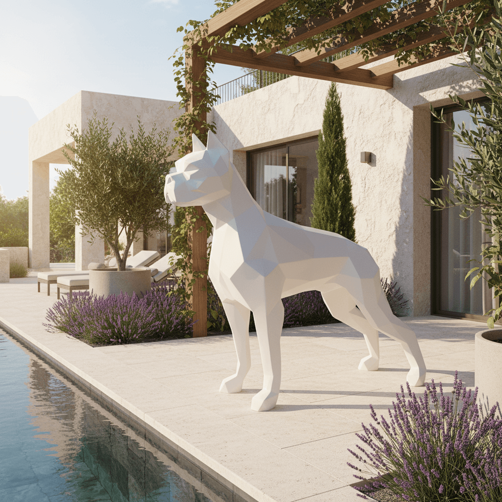 Designed with bold angular lines, this piece reinterprets the figure of the dog in a distinctive “origami” style, blending modern art and design.